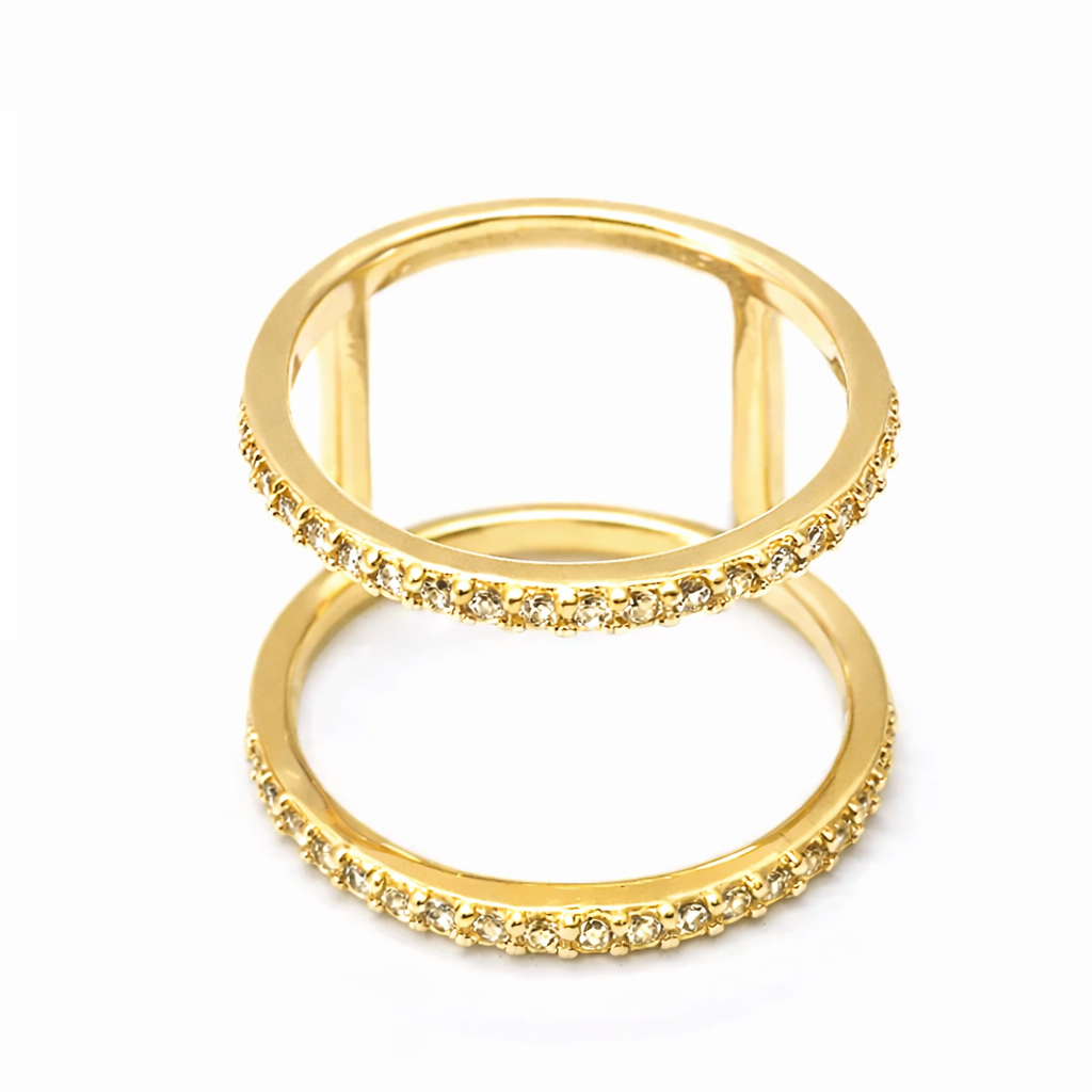 O anel cravejado banhado a ouro ilumina o visual com sofisticação e modernidade, sendo uma peça-chave para quem valoriza elegância atemporal.