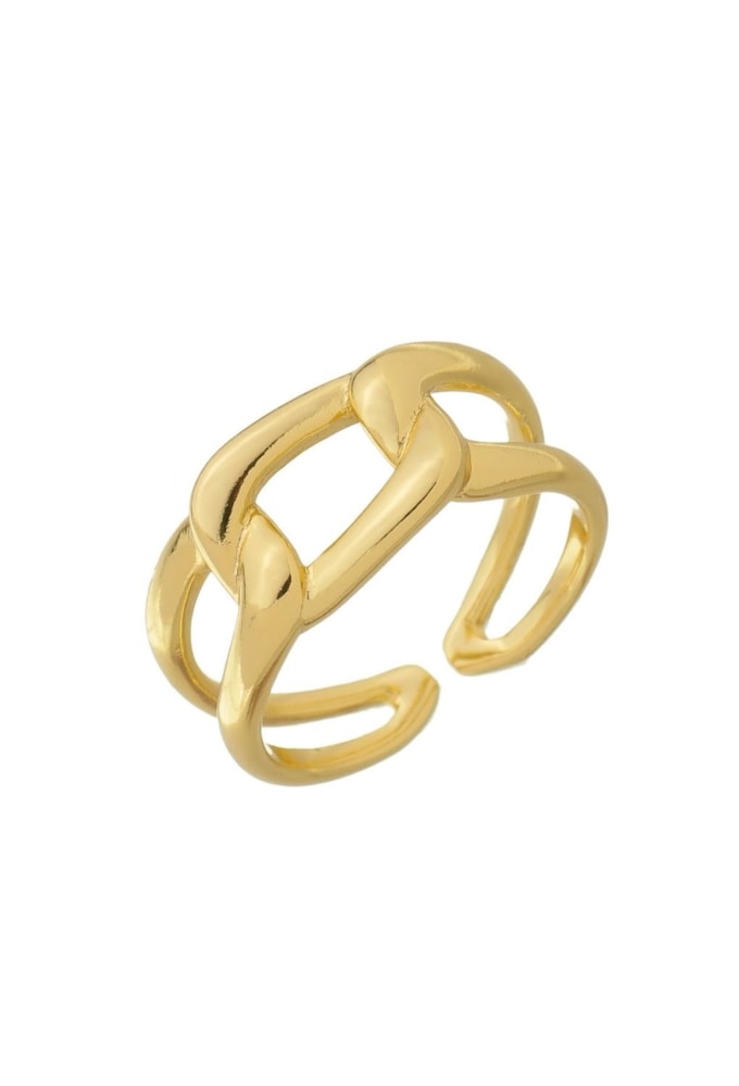 Os elos grandes trazem textura e movimento ao design, tornando o anel protagonista do look. É uma peça versátil que pode ser usada sozinha ou combinada com outros acessórios dourados minimalistas.