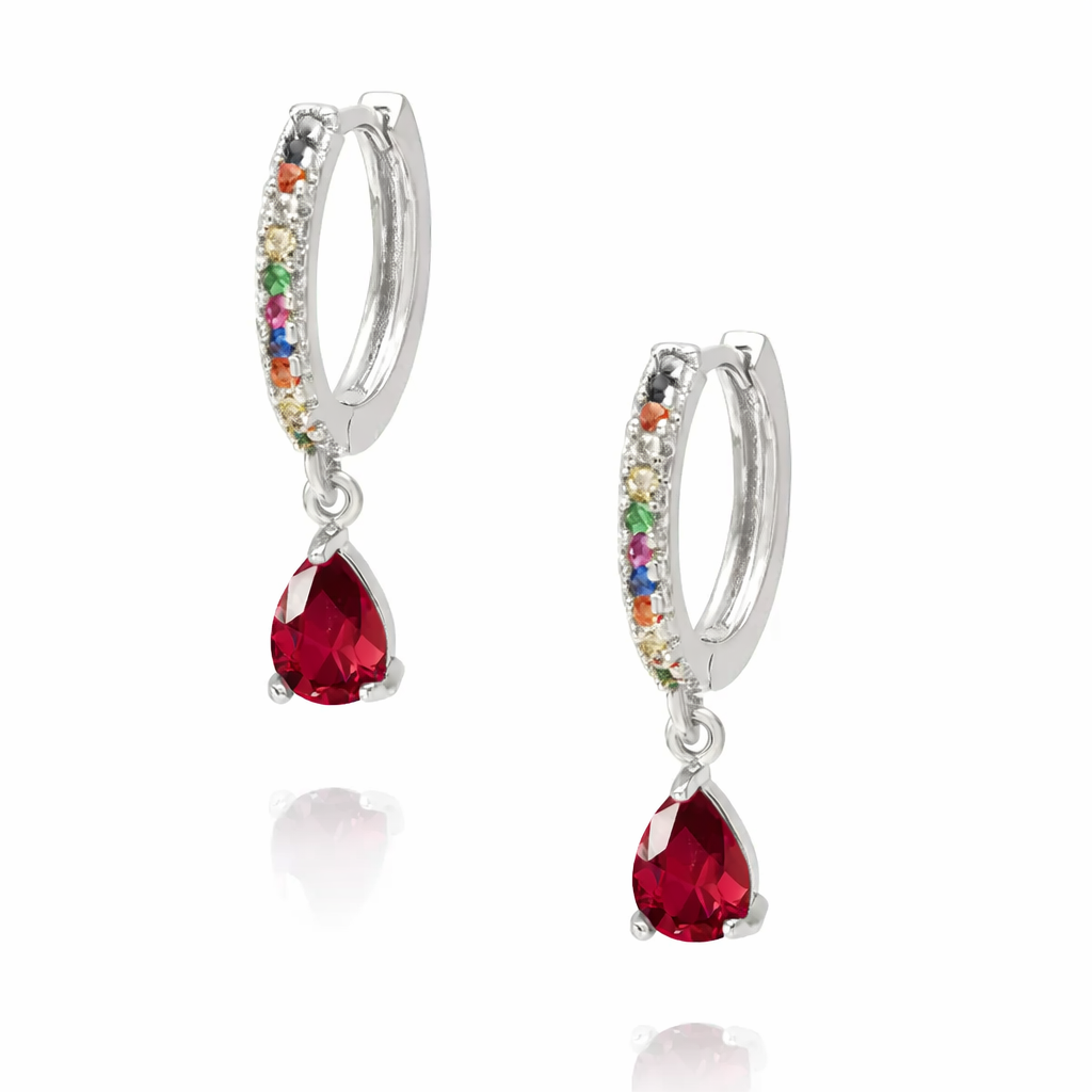 A argola cravejada colorida com gota vermelha é uma peça que une delicadeza e personalidade em um design sofisticado. O aro em ródio branco é cravejado com zircônias coloridas que trazem leveza e modernidade, enquanto o pingente em formato de gota vermelha adiciona intensidade e elegância.