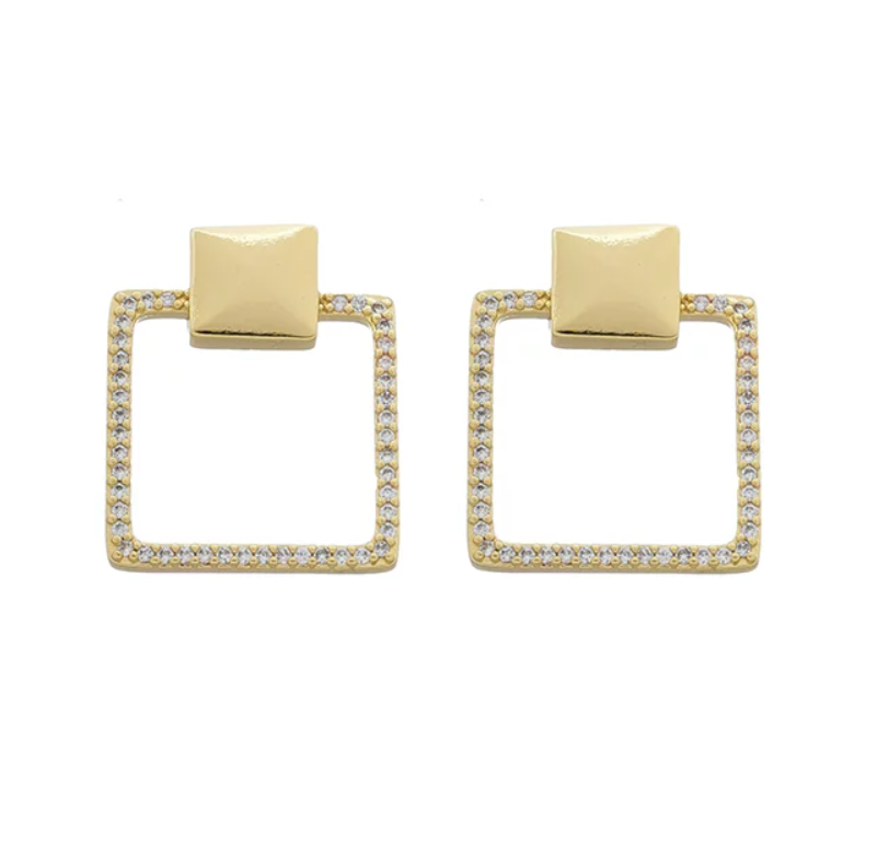 O Brinco Geométrico Quadrado Cravejado banhado a ouro é a combinação perfeita entre design contemporâneo e elegância clássica.
