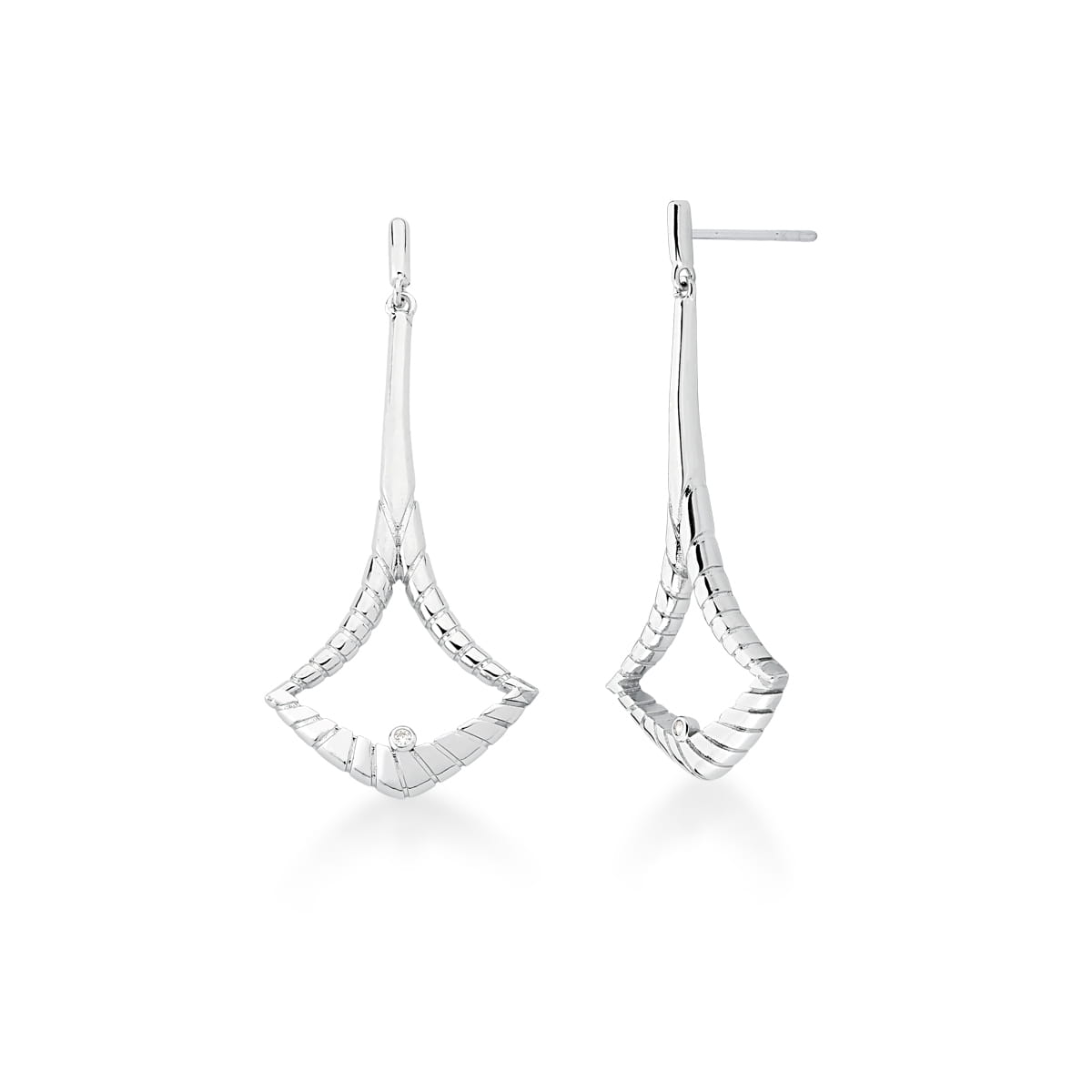 O formato em losango vazado cria leveza visual, enquanto o pequeno ponto de luz central adiciona brilho delicado e sofisticado. O acabamento em ródio proporciona aspecto prateado intenso e elegante.