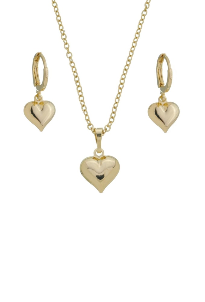 O conjunto de coração banhado a ouro é a definição de delicadeza com presença. Composto por colar com pingente de coração e brincos combinando, ele traz um brilho elegante e acabamento sofisticado que valoriza qualquer produção.
