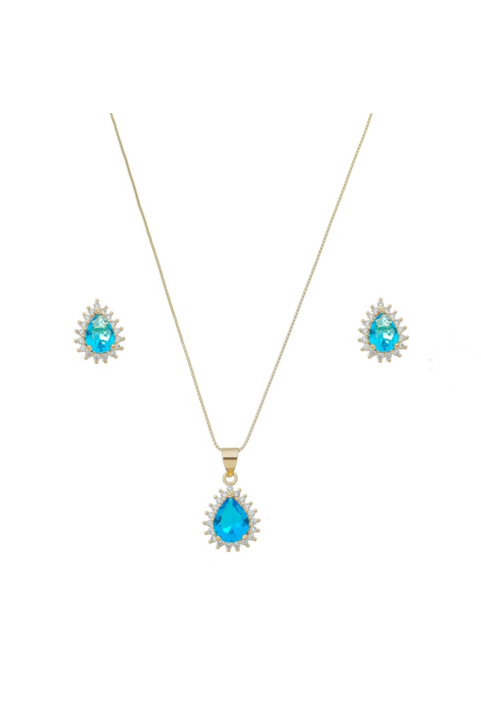 Composto por colar e brinco, o modelo traz pedra central em formato gota na tonalidade azul vibrante, contornada por delicadas zircônias que ampliam o brilho e valorizam a peça.