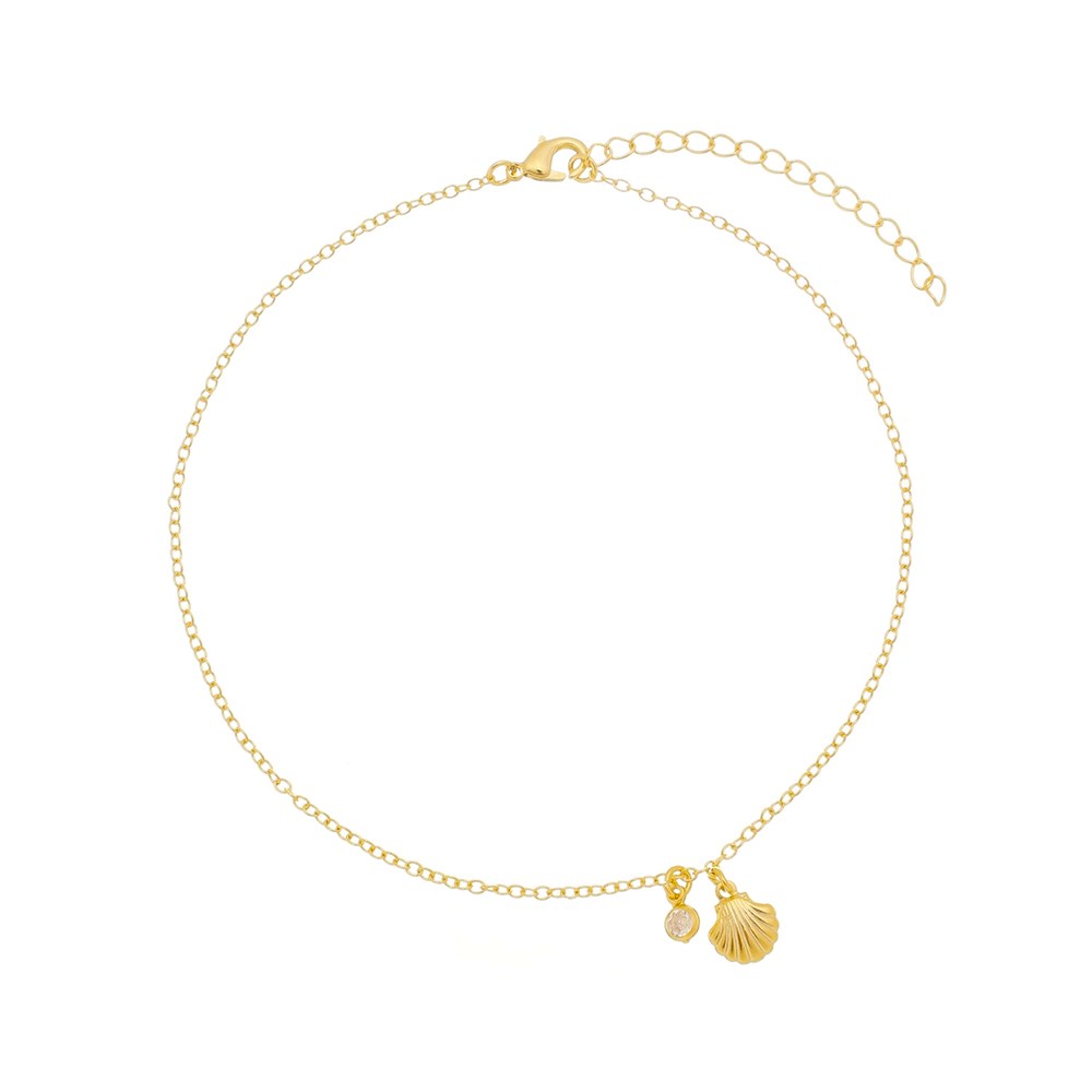 A Tornozeleira com Concha e Zircônia Banhada a Ouro é delicada e elegante, perfeita para compor produções leves e sofisticadas.
